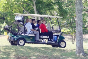 安倍晋三首相(右から2人目)が運転するゴルフカートに乗るトランプ米大統領(右端)=26日午前、千葉県茂原市の茂原カントリー倶楽部(代表撮影)…